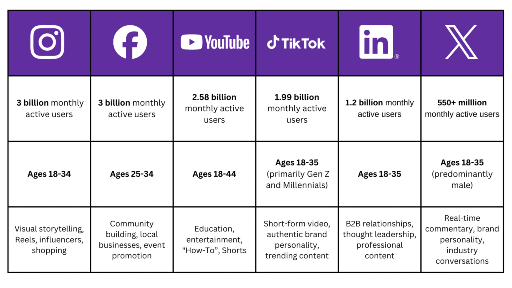 - Facebook (3 billion monthly active users, ages 25-34): Community building, local businesses, event promotion