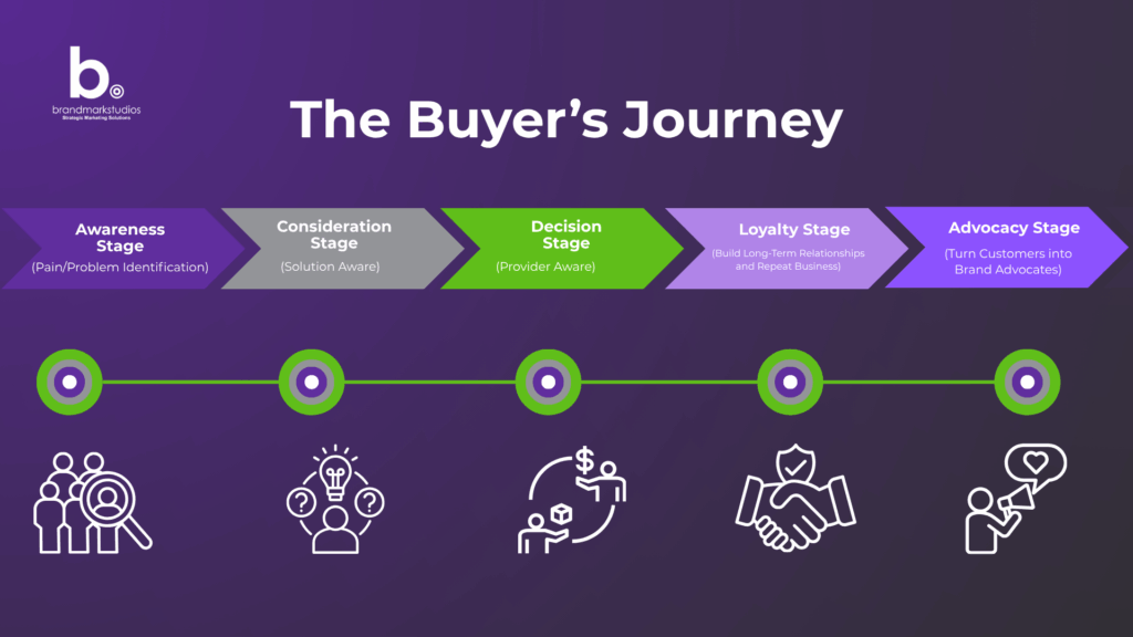 - Awareness: “I have a problem” – Marketing introduces your business as a trusted resource and demonstrates understanding of their challenges.